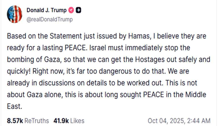 हमास के इस ऐलान के बाद डोनाल्ड ट्रंप ने इजरायल को तुरंत गाजा में हमले बंद करने को कहा है। ट्रंप ने सोशल मीडिया पर एक पोस्ट में लिखा- हमास द्वारा अभी जारी किए गए बयान के आधार पर, मेरा मानना ​​है कि वे स्थायी शांति के लिए तैयार हैं। इज़राइल को गाज़ा पर बमबारी तुरंत रोकनी चाहिए, ताकि हम बंधकों को सुरक्षित और जल्दी से बाहर निकाल सकें! अभी, ऐसा करना बहुत खतरनाक है। हम पहले से ही उन बारीकियों पर चर्चा कर रहे हैं जिन पर काम किया जाना है। यह सिर्फ़ गाज़ा की बात नहीं है, यह मिडिल ईस्ट में लंबे समय से शांति स्थापना की चाह में की जा रही कोशिश की बात है।