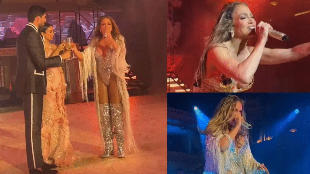 नेत्रा मंटेना और वामसी गदिराजू की भव्य शादी में पॉपस्टार जेनिफर लोपेज ने भी शानदार प्रस्तुति दी, जिसका वीडियो सोशल मीडिया पर छाया हुआ है। इस वीडियो में जेनिफर को एक चमकीले बॉडीसूट में देखा जा सकता है और वह अपना हिट नंबर ‘गेट ऑन द फ्लोर’ गाती नजर आ रही हैं और हर कोई उनकी धुन पर थिरकते नजर आ रहा है। जेनिफर की इस परफॉर्मेंस की सोशल मीडिया पर जमकर चर्चा हो रही है। लेकिन, कई को इंडियन वेडिंग के हिसाब से जेनिफर का आउटफिट पसंद नहीं आया। हालांकि, जेनिफर ने इंडियन वेडिंग थीम का भी ध्यान रखा था, उन्होंने इस इवेंट में एक इंडो-वेस्टर्न आउटफिट भी पहना था, जिसमें उनकी कुछ तस्वीरें सामने आई हैं।