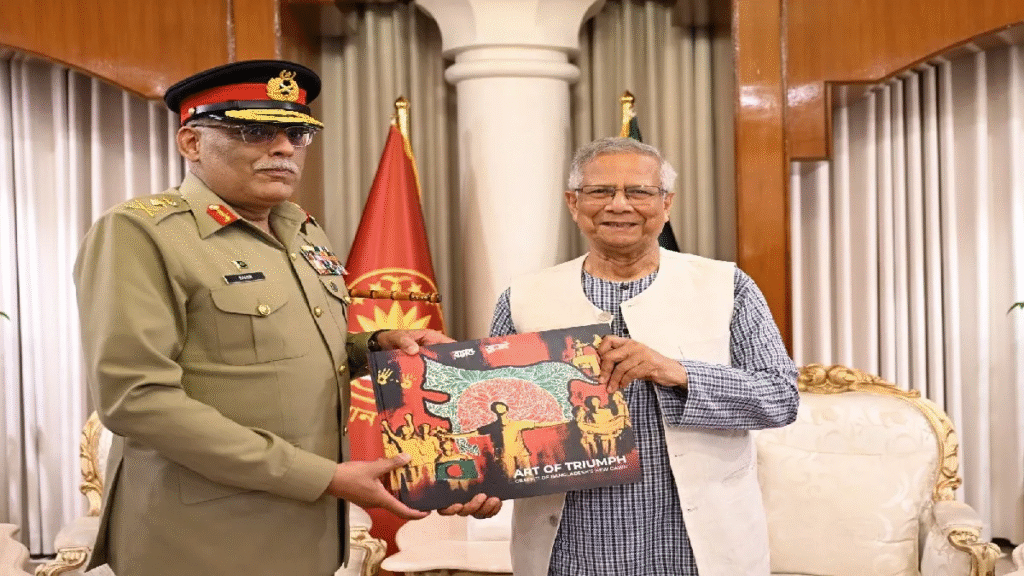Muhammad Yunus Nefarious Act: बांग्लादेश की अंतरिम सरकार के मुखिया मुहम्मद यूनुस हमेशा से अपने भारत विरोधी कदमों के लिए चर्चा में रहे हैं। अब यूनुस ने बेहद शर्मनाक हरकत की है। हाल ही में पाकिस्तान के वरिष्ठ सैन्य अधिकारी जनरल साहिर शमशाद मिर्जा बांग्लादेश पहुंचे थे। इस दौरान मोहम्मद यूनुस ने मिर्जा को एक किताब ‘Art of Triumph’ भेंट की, जिसके कवर को लेकर विवाद खड़ा हो गया है। किताब के कवर पर दिखाए गए नक्शे में भारत के पूर्वोत्तर राज्यों असम से लेकर अरुणाचल तक को बांग्लादेश का हिस्सा दिखाया गया है।